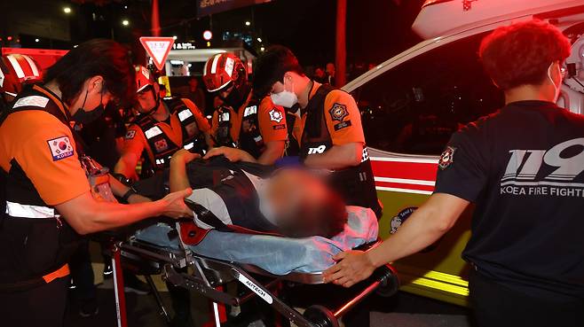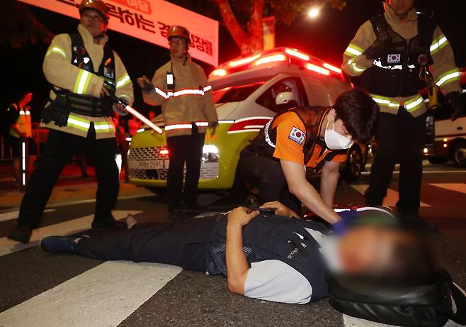 | ▲ 1박2일 투쟁에 나선 비정규직 노동자가 9일 오후 서울 서초구 대법원 앞에서 열린 제2차 노숙문화제 도중 경찰의 강제 해산 과정에서 다쳐 소방대원으로부터 응급 조치를 받고 있다. |