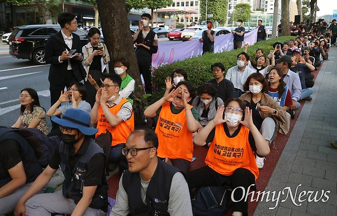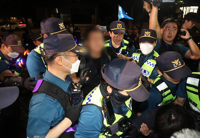 | ▲ 1박2일 투쟁에 나선 비정규직 노동자와 문화예술인, 시민들이 9일 오후 서울 서초구 대법원 앞에서 열린 제2차 노숙문화제 도중 경찰의 강제 해산에 항의하고 있다. |