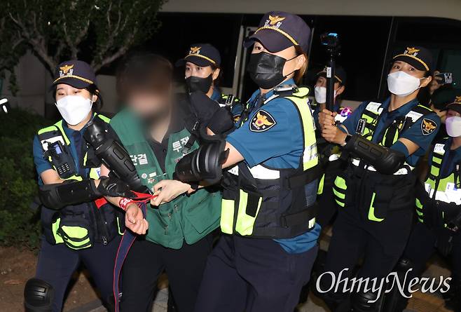 경찰이 9일 밤 서울 서초구 대법원 앞에서 비정규직 문제 해결을 촉구하며 농성을 벌인 비정규직 노동자 100여 명을 강제 해산했다. 경찰은 저항하지 않고 가부좌를 틀고 앉아있던 노동자들까지도 강제로 사지를 들어 하나하나 끌어냈다.