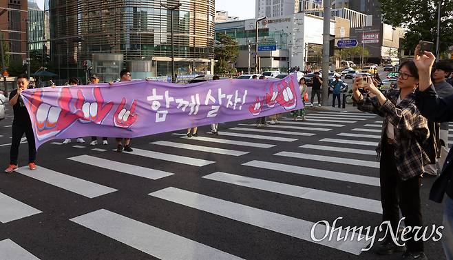| ▲ 1박2일 제2차 노숙문화제에 참석한 비정규직 노동자와 문화예술인, 시민들이 9일 오후 서울 서초구 대법원 앞 사거리 횡단보도에서 파란불이 들어올 때마다 건널목에 나가 ‘함께 살자’라고 적힌 현수막을 들어보이고 있다. |
