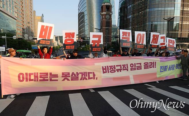 | ▲ 1박2일 제2차 노숙문화제에 참석한 비정규직 노동자와 문화예술인, 시민들이 9일 오후 서울 서초구 대법원 앞 사거리 횡단보도에서 파란불이 들어올 때마다 건널목에 나가 ‘비정규직 이제 그만’이라고 적힌 피켓과 현수막을 들어보이고 있다. |