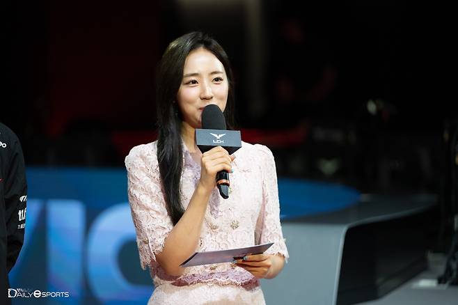 9일 오후 서울 종로구 그랑서울 롤파크 LCK 아레나에서 열린 2023 LCK 서머 스플릿 1라운드 T1과 한화생명e스포츠의 경기서 T1이 2대1로 승리했다. '페이커' 이상혁이 단독 POG를 받았다. 방송 중인 배혜지 아나운서.