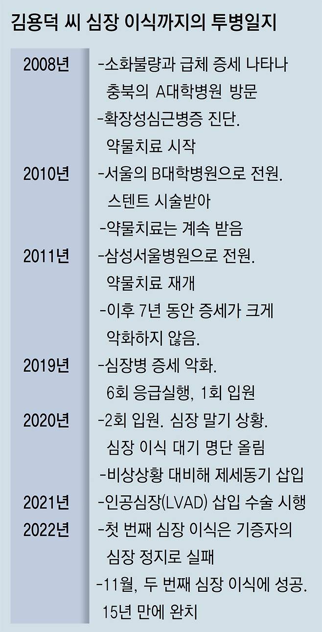 기다림은 결실로 이어졌다. 인공심장을 달고 14개월이 지났을 무렵, 마침내 두 번째 기회가 찾아왔다. 이번에는 무사히 이식 수술을 받을 수 있었다. 지난해 11월. 김 씨는 새 심장을 얻었다.