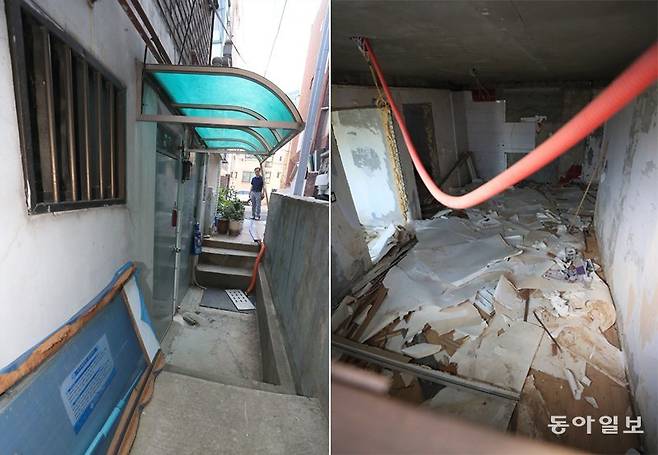 물막이판 아직도 제대로 설치 안 하고, 침수 주택 10개월째 방치 지난해 8월 폭우로 침수 피해를 입은 서울 관악구 반지하 집의 9일 모습. 빗물이 집 안으로 들어오는 걸 막는 물막이판(차수판)이 제대로 설치되지 않은 채 방치돼 있다(왼쪽 사진). 지난해 폭우 당시 일가족 3명이 사망한 인근 반지하 집은 10개월이 흐른 지금까지 벽지 등이 바닥에 널려 있었다. 김재명 기자 base@donga.com