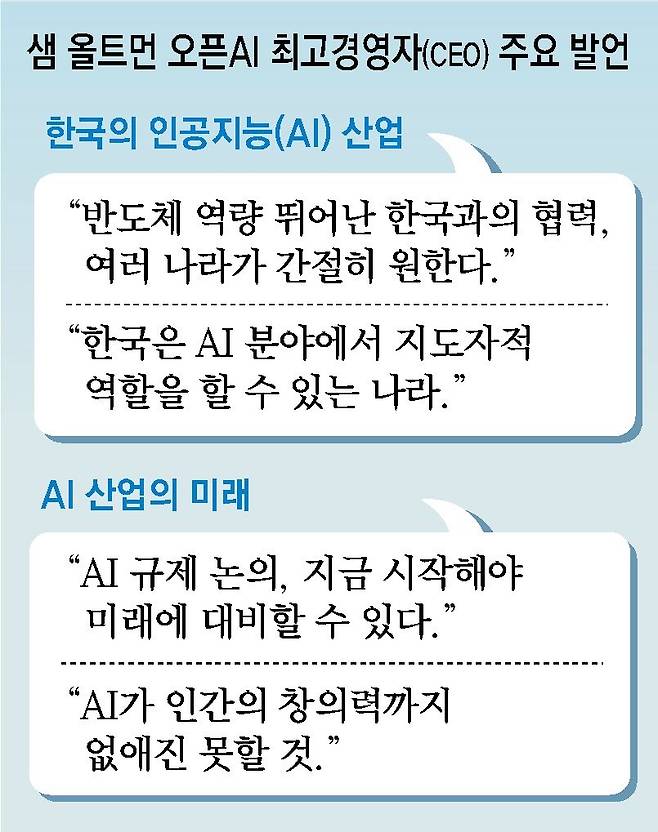 “한국이 규제 등 인공지능(AI) 분야에서 지도자적인 역할을 할 수 있을 거라고 생각합니다. AI 규제 논의는 지금 시작해야 앞으로의 급속한 기술 발전에 대응할 수 있습니다.”(샘 올트먼)