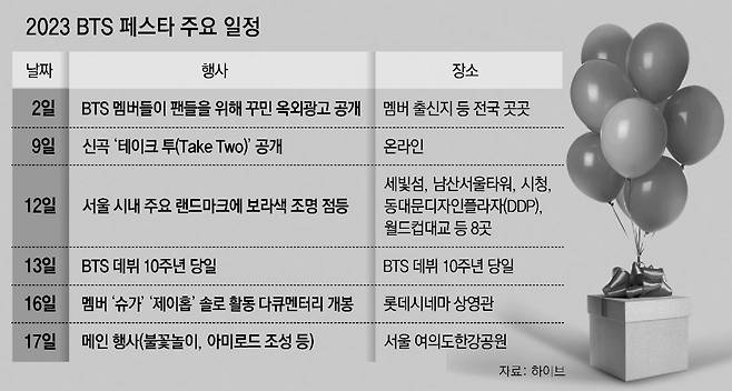 BTS는 매년 6월 13일 데뷔일 전후에 축하 행사를 열어 왔다. 특히 올해는 10주년을 맞아 지난달 31일부터 이달 17일까지 온·오프라인에서 각종 행사가 열린다.