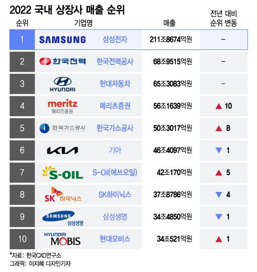 조사 결과 삼성전자는 지난해 별도 기준 매출 211조8674억원으로 처음으로 200조원을 돌파했으며, 연결기준으로는 302조2313억원으로 '매출 300조원 시대'를 열어 1위에 올랐다. 삼성전자는 2002년부터 지난해까지 21년간 이 순위에서 1위를 지켰다.