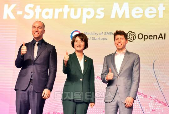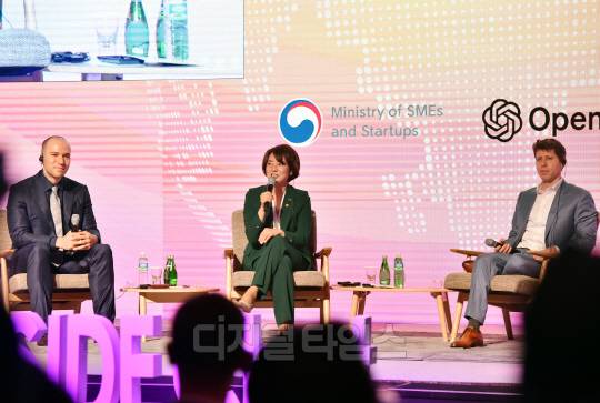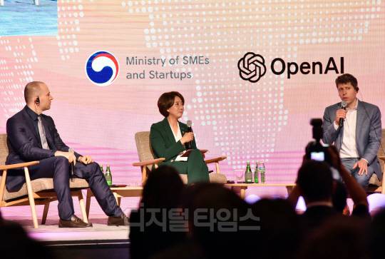 그렉 브로크만 오픈AI 회장, 이영 중소벤처기업부 장관, 샘 알트만(Sam Altman) 오픈AI(OpenAI) 대표가 9일 서울시 영등포구 여의도 63스퀘어에서 진행된 'K-Startups meet OpenAI'에서 참석자들의 질문에 답하고 있다.