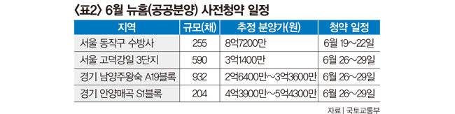 또 이달부터 올해 말까지 서울 동작구 수도방위사령부(수방사) 땅과 강동구 고덕동 등 수도권 알짜 부지에서 공공분양(뉴홈) 사전청약 물량도 나온다. 국토교통부는 6월 7일 올해 사전청약 물량을 기존 7000채에서 1만 채로 늘리고, 분양 시기도 기존 2회에서 3회로 확대하겠다고 발표했다. 시기별로 6월 1981채, 9월 3274채, 12월 4821채가 나온다. 공공분양은 분양가가 시세보다 20~30% 낮아 실수요자의 청약 수요가 몰릴 것으로 예상된다.
