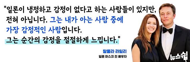 하지만 분 단위로 스케줄을 관리하며 자신의 모든 시간을 업무에 쏟는 머스크였기에 탈룰라 라일리도 헤어질 수밖에 없었습니다. 그녀와 헤어졌을 무렵, 자신의 전기를 쓰고 있는 기자 애슐리 반스에게 머스크는 물었습니다. "여자 친구를 사귀고 싶습니다. 데이트하는 데 일주일에 5~10시간 정도를 생각하고 있습니다. 여자들은 일주일에 몇 시간이나 애인을 만나고 싶어 하나요. 10시간 정도가 최소 수준인가요?" 목표를 이루는 데 몰두하는 일론 머스크에게는 연애나 사랑은 상당한 시간을 투자해야 할 부차적인 일 정도인지도 모르겠습니다.