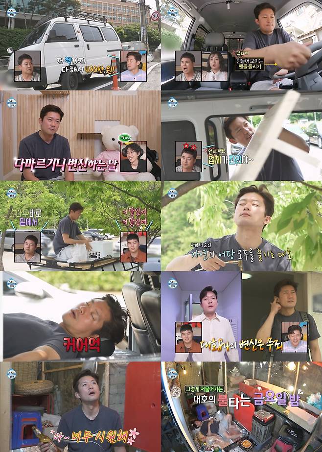 목적지는 김대호 아나운서가 평소 자주 찾는다는 MBC 근처 행주산성이었다. 특보 대기 근무 후 오후 생방송 진행을 위해 출근하기 전까지 시간을 보내려 이곳을 찾은 것. 그는 먼저 가득 싣고 온 나무판과 각종 도구를 꺼내 셀프 캠핑카 개조에 도전했다. 뚝딱 평상이 완성됐지만, 높이 좌절에 실패해 접을 때마다 평상이 천장에 걸려 짠내를 유발했다.