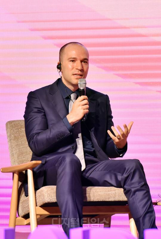 그렉 브로크만 오픈AI 회장이 9일 서울시 영등포구 여의도 63스퀘어에서 진행된 'K-Startups meet OpenAI'에서 참석자들의 질문에 답하고 있다.