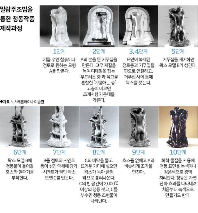 청동 작품은 원형 하나를 가지고 다수의 작품을 제작할 수 있다. 원형의 재료는 찰흙이나 석고 등 여러 가지가 될 수 있다. 이렇게 만든 원형을 토대로 빈 주형을 만들고, 그 주형에 밀랍(왁스)을 부어 왁스형을 만들고 다시 왁스를 녹여 그 안으로 청동물을 붓는 것이 기본이다. 왁스는 녹고 그 빈 공간에서 청동물은 굳어지는데 이후 점토를 깨서 그 안의 청동을 가져가는 것이 포인트다. 이를 '밀랍주조법(lost wax casting)'이라고도 한다. 직지를 찍은 세계 최고 금속활자도, '지옥의 문'도 이 기법이 이용됐다. 밀랍주조법을 이용한 청동 주조 과정은 10단계로 나눌 수 있다.