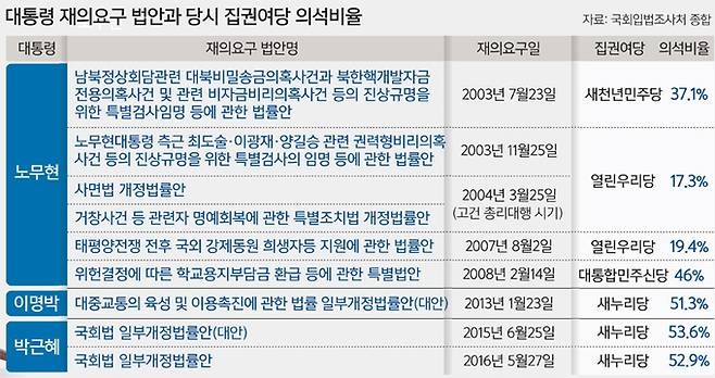 이 가운데 45건은 초대 대통령 때 일이다. 박정희 전 대통령은 5건, 노태우 전 대통령 7건, 노무현 전 대통령 6건, 이명박 전 대통령 1건, 박근혜 전 대통령 2건 등이다. 거부권은 헌법 53조에 의해 부여된 입법부에 대한 견제 수단이다. 국회에서 의결된 법안이 정부로 이송되고, 대통령의 서명과 함께 법률로 공포된다. 이때 법률에 이견이 있을 경우 15일 이내에 국회에 재의를 요구할 수 있다. 이것이 거부권이다. 재의 요구된 법안도 재적 의원 과반수의 출석과 출석의원 3분의 2 이상이 찬성해 재의결하면 법률로 확정된다.