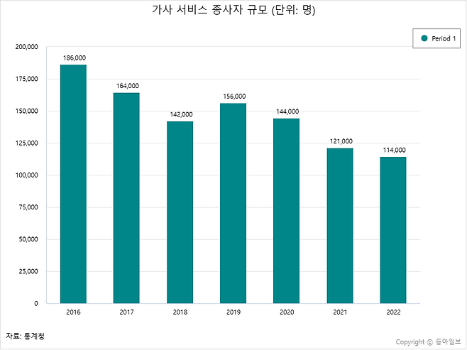 내국인 가사 인력의 수는 크게 줄어들고 있는 것으로 보인다. 통계청에 따르면 가사 서비스 종사자 수는 2016년 18만6000명에서 6년 만인 지난해 11만4000명으로 38.7% 줄었다.