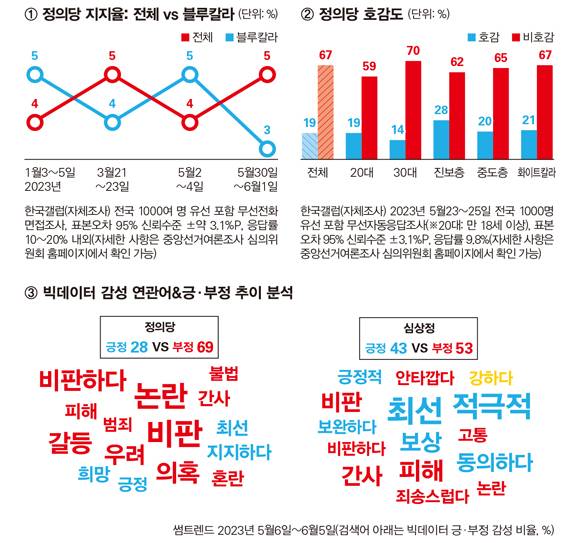 빅데이터를 살펴보면 정의당의 존재감이 사라진 원인은 '정체성 상실과 리더십의 붕괴'로부터 찾게 된다. 빅데이터 심층 분석 도구인 썸트렌드로 5월6일부터 6월5일까지 정의당과 심상정 의원의 빅데이터 감성 연관어 및 긍부정 감성 비율을 도출해 보았다. 정의당에 대한 빅데이터 연관어는 '비판' '논란' '의혹' '우려' '갈등' '간사' '지지하다' '최선' '희망' '혼란' '피해' '범죄' '불법' 등으로 나왔고, 심상정에 대한 감성 연관어는 '최선' '적극적' '비판' '피해' '보상' '간사' '동의하다' '안타깝다' '긍정적' '보완하다' '고통' '강하다' '죄송스럽다' '논란' 등으로 나타났다.