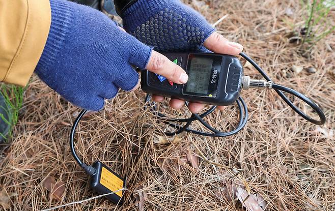 주변 토양 염류까지 확인 강기래 나무의사가 토양전기전도도(EC) 측정기로 청주 제35호 보호수 주변 토양의 염류를 확인하고 있다.