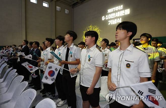 (서울=연합뉴스) 김인철 기자 = 10일 오후 서울 중구 훈련원공원 종합체육관에서 열린 6·10 만세운동 기념식에서 참석자들이 6ㆍ10만세의 노래를 부르고 있다. 2023.6.10