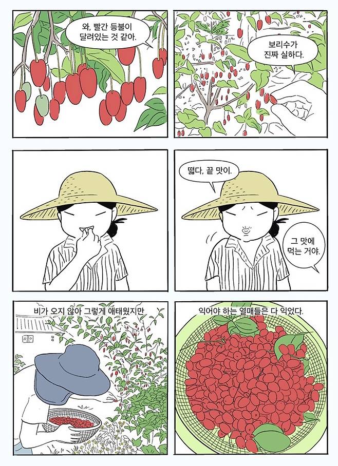 봄의 포도밭과 복숭아 꽃 피는 동네를 그리고 여름의 수박과 장마와 포도송이를 그리고 이윽고 가을이 오기 시작하자 우리는 초조해지지 시작한다. 마감 날은 다가오는데 원고는 아직 한참 밀렸다. 스트레스로 몸살이 나서 진짜 마감날을 못 맞추면 어쩌나. 그러게 남의 돈을 먼저 받고 일하는 것이 아니었어. 제주와 충주를 오가며 일하는 것 자체가 무리였어. 콘티는 또 왜이렇게 안 풀리지….. 뒤죽박죽 머리를 쥐어짜는 날들이 이어졌다. "언니. 너무 힘들어요. 시어머니가 나를 힘들게 해요. 아들이 나를 힘들게 해요. 남편은 더 나를 힘들게 해요. 우리 남편 갱년기인가요, 맨날 화를 내요." 사실 우리를 힘들게 하는 것은 마감 날짜이다.
