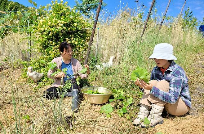 | ▲ 일하는 거 맞아요, 맞다니깐요 포도잎을 다듬는 필자와 연돌. |