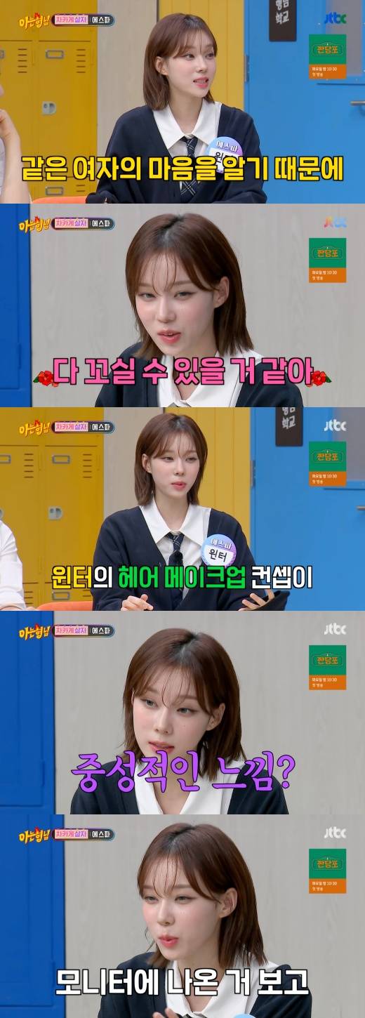 이에 윈터는 “근데 솔직히 난 여자니까 여자의 마음을 알잖아. 그니까 내가 남자가 되면 다 꼬실 수 있을 거 같다”라고 말했다.