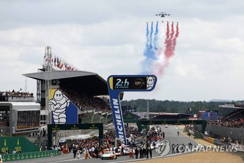 epa10683578 A general view over the grid during the French army's flyover prior the 24 Hours of Le Mans Centenary, the 91st edition of the race in Le Mans, France, 10 June 2023. EPA/YOAN VALAT