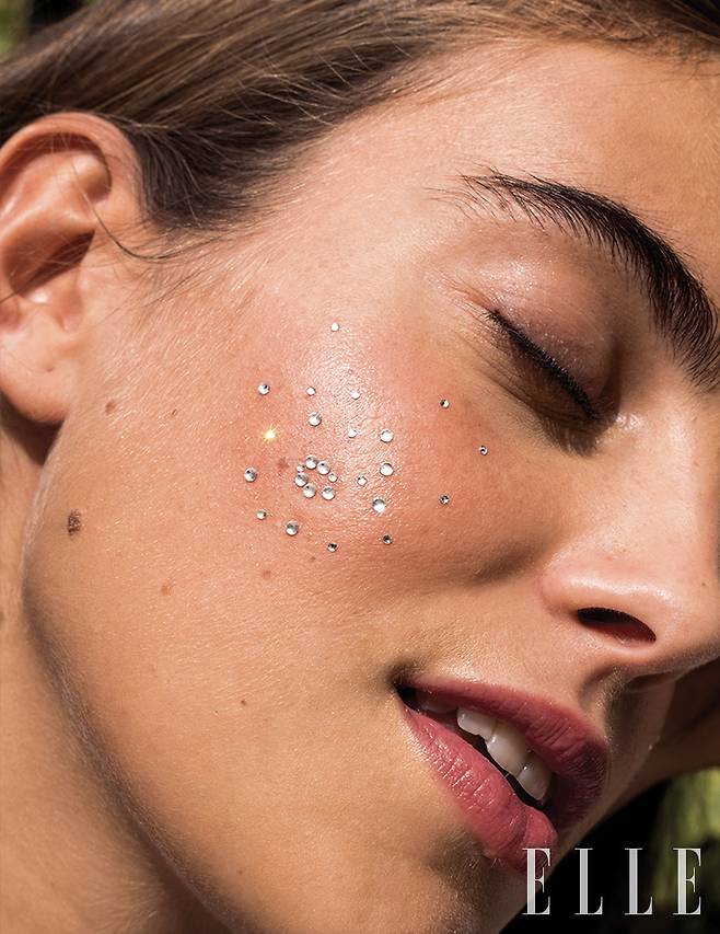 별빛이 흐르듯 반짝이는 뺨! 우선 세미 매트한 텍스처의 Hera 블랙 쿠션, 23N1 컬러를 얇게 터치한다. 치크에는 Feev 하이퍼 컬러 세럼 비건 블러셔, 로지 코지를 광대 전체에 얹어 헬시한 혈색을 더한다. 마지막으로 Make Up For Ever 스트라스 안에 있는 화이트 큐빅을 여러 개 골라 볼에 콕콕 붙여주면 끝이다.