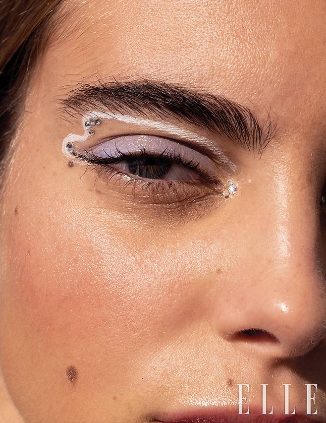 06 샤인 스노우로 눈 앞머리에서 위로 5mm 정도 띈 부분부터 과감하게 날개 모양을 그려줄 것. 쌍꺼풀 부근에만 Rom&Nd 배러 댄 아이즈 우유 시리즈, 말린 라벤더 팔레트의 연보라 셰이드를 발라주고 그 위에 The Saem 샘물 세럼 립글로스, 투명 코팅을 얹어준다. SimiHaze Beauty 아이플레이 젬 스티커 팩의 큐빅을 하나씩 잘라 눈 앞머리와 날개 끝부분에 붙이면 시선 강탈 준비 완료.