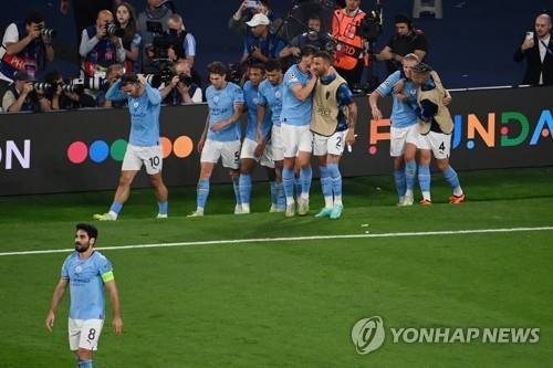 epa10684260 Players of Mancester City celebrate scoring the 1-0 goal with his teammates during UEFA Champions League Final soccer match between Manchester City and Inter Milan, in Istanbul, Turkey, 10 June 2023. EPA/GEORGI LICOVSKI