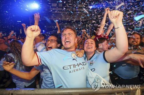 Manchester City fans celebrate full time at the Depot Mayfield during a screening of the UEFA Champions League final between Manchester City and Inter Milan in Istanbul, Saturday, June 10, 2023, in Manchester, England. (Nigel French/PA via AP) UNITED KINGDOM OUT; NO SALES; NO ARCHIVE; PHOTOGRAPH MAY NOT BE STORED OR USED FOR MORE THAN 14 DAYS AFTER THE DAY OF TRANSMISSION; MANDATORY CREDIT
