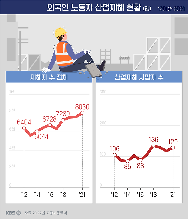 보고서와는 다른 기준으로 집계된 2022년 고용노동백서 자료를 봐도 외국인 노동자의 산업재해는 꾸준히 증가하는 것으로 나타납니다.