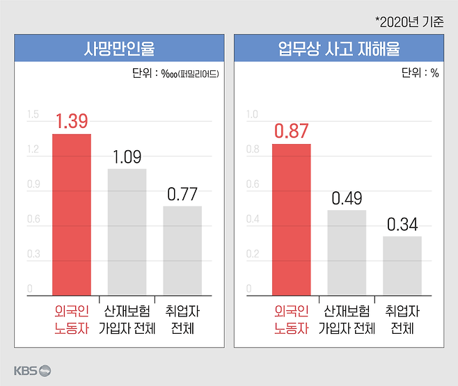 한국보건사회연구원이 지난해 발간한 '이주노동자 산업안전보건 현황과 정책 과제' 보고서에 따르면 외국인 노동자의 '사망만인율' 즉 인구 만 명 당 발생하는 사망자 수 비율은 1.39 퍼밀리어드로 산재보험 가입자 전체(1.09 퍼밀리어드)보다 높았습니다. 노동자 100명당 발생하는 사고 재해자 수 비율인 '사고재해율'도 외국인 노동자가 0.87%로 내·외국인 전체 노동자(0.49%)보다 높았습니다.