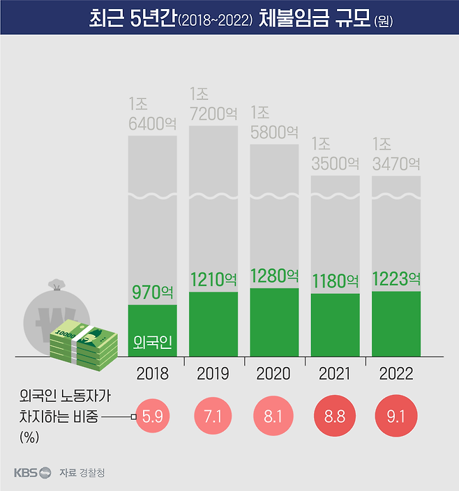 외국인 노동자가 받지 못한 체불임금은 지난해 기준으로 1,223억 원이 넘습니다. 2018년 970여억 원이었던 체불임금 규모는 이듬해 1천억 원대가 됐습니다. 같은 기간 집계된 '임금체불 사건 외국인 노동자 수'는 2만 8천명 선을 유지했습니다.