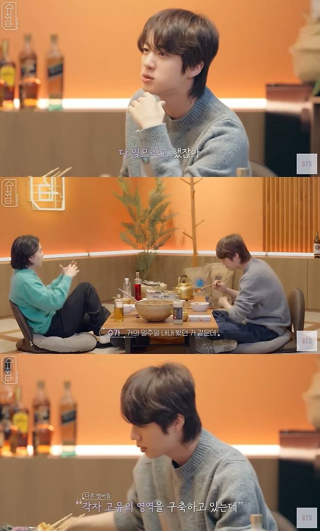 슈가는 "형이 그때 했던 얘기 중에 슬펐던 게 다른 멤버들은 각자 고유의 영역에서 일을 하고, 구축하고 있는데 '왜 나는 안될까'라면서 되게 고민했었다. 근데 나는 형만의 고유한 영역이 있다고 본다"고 위로했다.