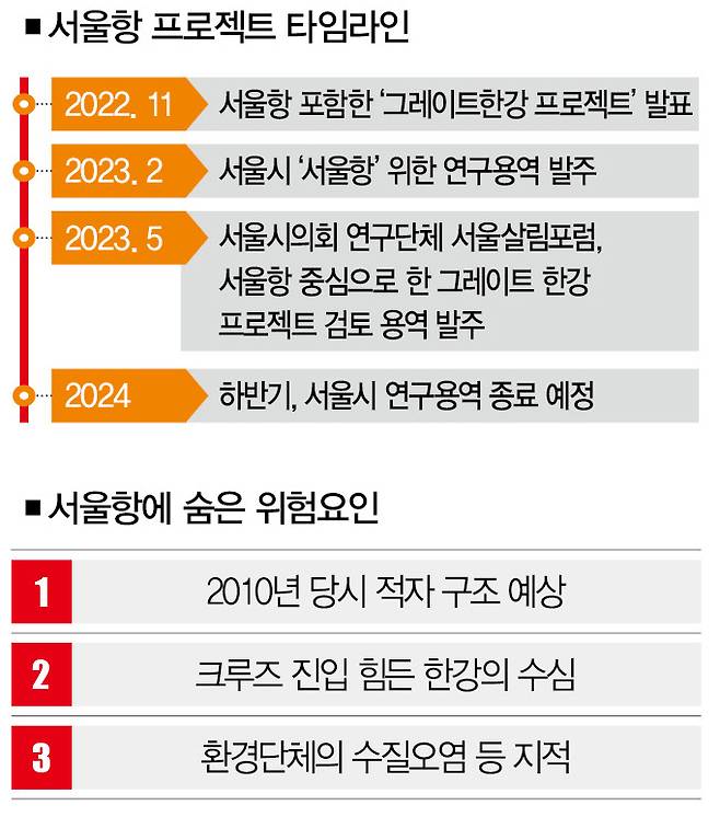 서울항은 여의도에 있는 여객선 선착장을 더 키워 국내선ㆍ국제선이 드나드는 터미널로 만들겠다는 게 골자다. 2010년 오세훈 시정市政이 기획했던 '서울항'은 오 시장이 다시 서울시정의 수장에 오른 2022년 공론의 장에 모습을 드러냈다.