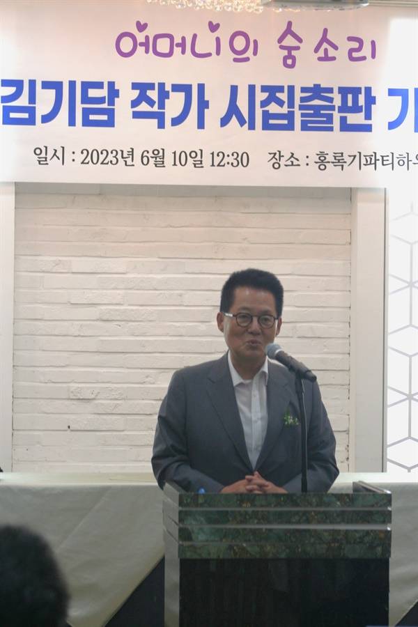 첫 번째 축사로 나선 박지원 전 원장은 "오늘 이희호 여사 4주기여서 국립현충원에서 추모식을 하고 여기 왔다. 또 KTX 타고 광주에 가야 한다"면서 "오늘 여기 와서 여러 좋으신 분들 다 뵈었다. 오랜만에 만난 권영길·천영세 대표님 감사하다"고 말했다.
