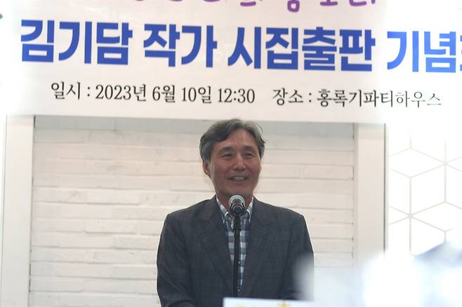 | ▲ 김기담 시집출판기념회 김기담 시인이 자신의 출판기념회가 열린 안산 파티하우스 홀에서 인사말을 하는 모습이다. |