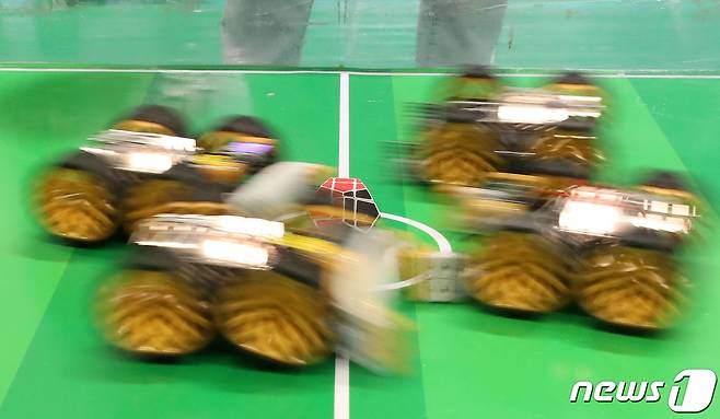 (안양=뉴스1) 김성진 기자 = 11일 경기도 안양시 동안구 비산동 안양실내체육관에서 열린 제20회 안양사이버과학축제에서 로봇축구 대회가 진행되고 있다.