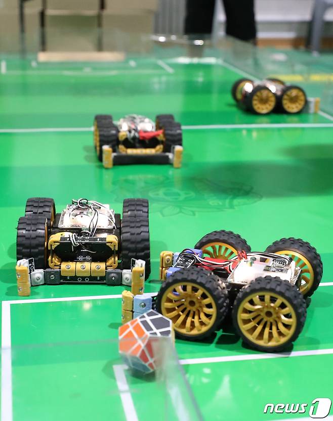 (안양=뉴스1) 김성진 기자 = 11일 경기도 안양시 동안구 비산동 안양실내체육관에서 열린 제20회 안양사이버과학축제에서 로봇축구 대회가 진행되고 있다.