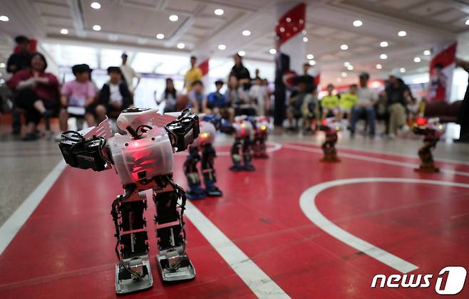 (안양=뉴스1) 김성진 기자 = 11일 경기도 안양시 동안구 비산동 안양실내체육관에서 열린 제20회 안양사이버과학축제에서 미니로봇들이 춤을 추고 있다.