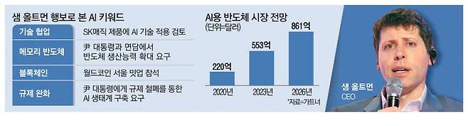 올트먼 CEO는 AI 생태계 구축에서 반도체 역할도 강조했다. 지난 9일 윤석열 대통령과 만난 자리에서 그는 "AI 시대에는 막대한 데이터 양 때문에 메모리 반도체 수요도 늘 것"이라며 삼성전자·SK하이닉스와 같은 한국 반도체 기업에 생산능력을 확대해달라고 요청했다.