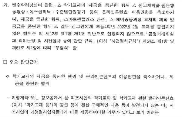 | ▲ 공정위의 쎈수학 분쟁건 무혐의 통보 관련 자료(2023년 1월). 2022년 10월 국정감사에 오른 일명 '쎈수학' 사건은, 본사인 ㈜신사고아카데미가 2019년까지 신규 계약을 체결해놓고도 2020년 4월 느닷없이 가맹사업을 중단하며 벌어진 분쟁으로 알려져 있다. 이 사건은 공정위에 신고됐는데 공정위는 '본사 무혐의'로 결론내렸다. |