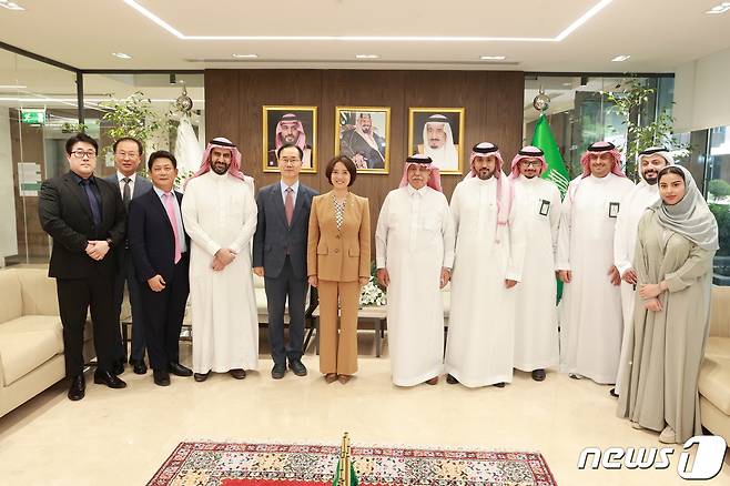 (서울=뉴스1) = 이영 중소벤처기업부 장관이 11일(현지시간) 사우디아라비아 리야드에 위치한 GAFT(General Authority of Foreign Trade)에서 마지드 빈 압둘라 알 까사비 상무부 장관 등 참석자들과 기념촬영을 하고 있다.