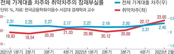 11일 이윤수 서강대 경제학과 교수가 최근 한국금융학회 주최로 열린 ‘한국 부채의 진단과 해결해야 할 것, 하지 말아야 할 것’ 심포지엄에서 발표한 보고서를 보면, 지난 2월 기준 취약차주의 잠재부실률은 23.60%로 전체 가계대출 차주(2.45%)의 9.6배를 기록했다. 지난해 1분기와 비교하면 취약차주의 잠재부실률(20.86%)이 2.74%포인트 오르는 동안 전체 차주(2.22%)는 0.23%포인트 상승에 그쳐 취약차주의 부실 위험 증가 속도가 더 빨랐다. 이는 나이스평가정보가 보유한 전체 가계대출 차주 1985만명 내역 중 임의 추출한 100만명을 분석한 결과다.