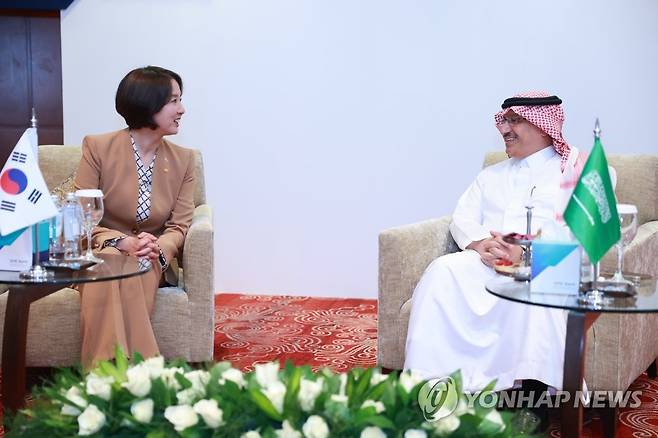 (서울=연합뉴스) 이영 중소벤처기업부 장관(왼쪽)이 11일(현지시간) 사우디아라비아 크라운플라자 리야드호텔에서 개최된 공동펀드 조성 체결식에서 요세프 알 베냔(Yousef Al-Benyan) SME BANK 이사회 의장 겸 교육부 장관과 사전환담을 나누고 있다. 2023.6.11