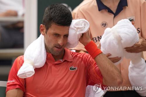 Serbia's Novak Djokovic uses towels packed with ice to cool off during the men's singles final match of the French Open tennis tournament against Norway's Casper Ruud at the Roland Garros stadium in Paris, Sunday, June 11, 2023. (AP Photo/Christophe Ena)