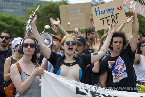 epa10685301 People protest at a public lecture by Women's rights activist Kellie-Jay Keen, a.k.a. 'Posie Parker' (not pictured), during a 'Let Women Speak' rally on the place des Nations in front of the European headquarters of the United Nations, in Geneva, Switzerland, 11 June 2023. EPA/MARTIAL TREZZINI