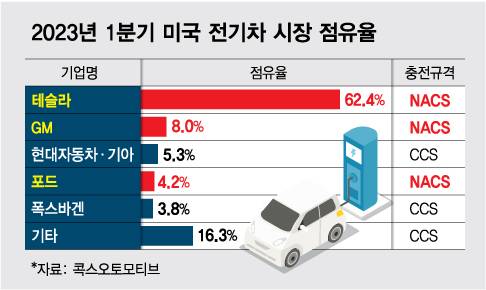 테슬라·포드·GM의 미국 시장 전기차 점유율은 70%를 웃돈다. 양사의 전환으로 NACS가 CCS를 대신해 북미 표준으로 자리잡을 전망이다. 테슬라의 급속 충전소인 슈퍼차저는 미국과 캐나다의 전체 급속 충전기 수량의 60%에 달한다. 내년에 7500개를 추가할 계획인데, 미국 소비자가 향후 충전 때문에라도 테슬라·GM·포드 등 미국산 차를 선호할 가능성도 커졌다.