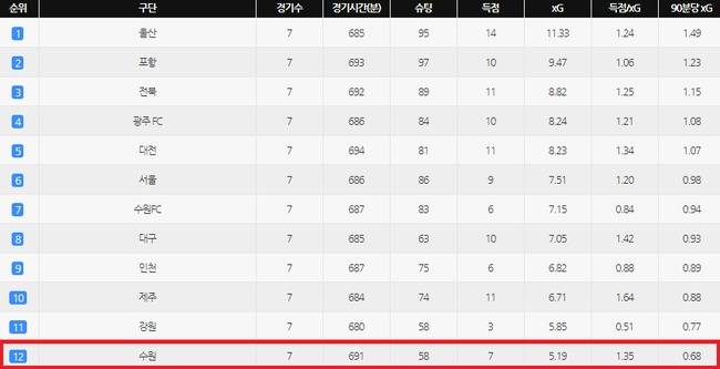 그럼에도 기대만큼 결과가 따라오지 않는 상황. 기대 득점(xG) 값에서 돌파구를 찾을 수 있다. 지난 7경기 수원이 시도했던 슈팅은 모두 합쳐 58회다. K리그1 12개 클럽 전체를 놓고 봐도 가장 낮다. 그만큼 xG 값도 5.19점으로 꼴찌일 수밖에 없다.