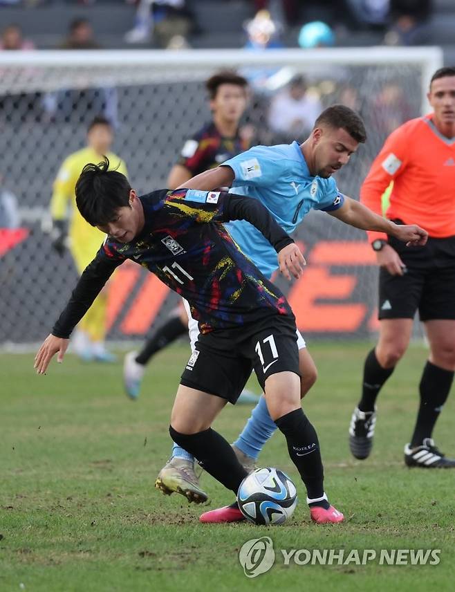 (라플라타=연합뉴스) 임화영 기자 = 11일(현지시간) 오후 아르헨티나 라플라타 스타디움에서 열린 2023 국제축구연맹(FIFA) 20세 이하(U-20) 월드컵 3·4위전 한국과 이스라엘의 경기에서 강성진이 상대 선수와 볼경합을 하고 있다. 2023.6.12